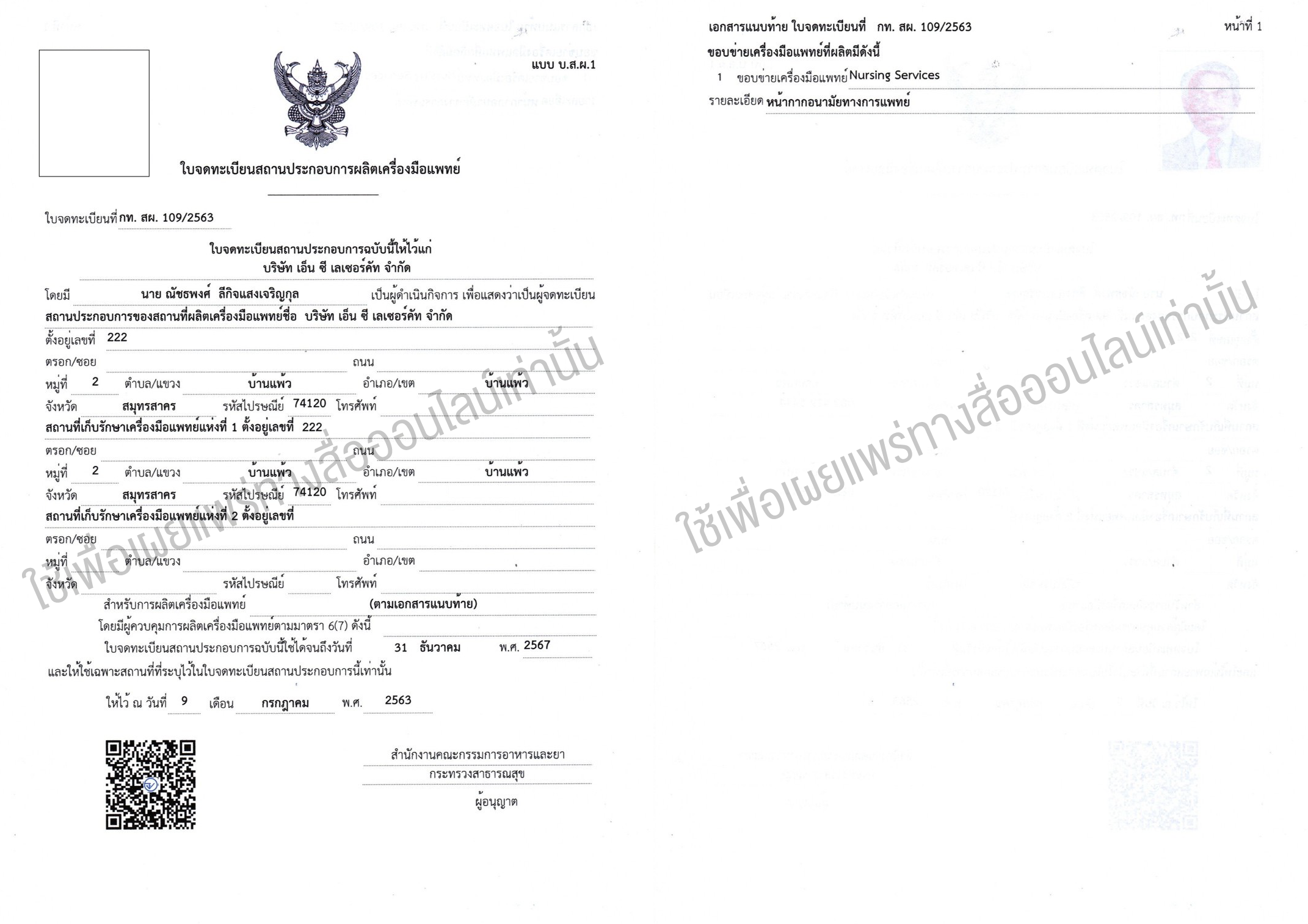ใบจดทะเบียนสถานประกอบการผลิตเครื่องมือแพทย์ (กท. สผ.109/2563)